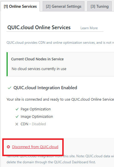 Once that is done, navigate to WordPress Dashboard > LiteSpeed Cache > General > Online Services and click the Disconnect from QUIC.cloud link.