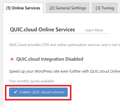 Refresh the page, and click the Enable QUIC.cloud services button to reconnect your domain to your QUIC.cloud account.