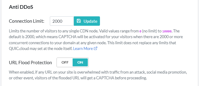 QUIC.cloud provides several protections against DDoS attack. The QUIC.cloud dashboard allows you to enable and configure these options if you are on the Standard Plan. (Are you under attack right now? Read this first!)